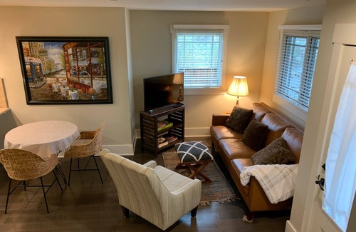 Completely private modern guesthouse on quiet cul de sac. Wonderful covered front porch. Open concept first floor includes living and dining area. Full kitchen. There is a spacious half bath and brand new apartment size washer and dryer. Upstairs you will find a bright and cheery bedroom with a large closet and a nice size bathroom with large shower stall. Heating, air conditioning and wifi are included.