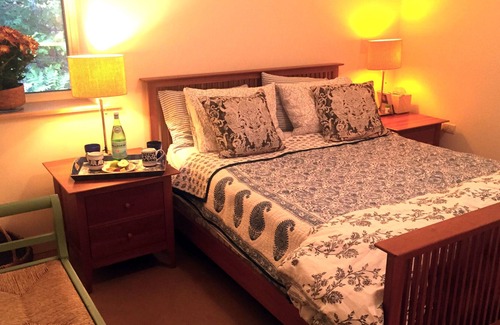 Upon entering the home, the open concept kitchen, dining, and living room welcome you inside. The custom designed kitchen has maple cabinets and slate counters and is fully equipped to cook any meal. The spacious and light-filled living room offers views of the garden and a flat screen TV with cable, Apple TV, and DVD player. Two downstairs bedrooms (one with queen bed and the other with twin bed) share a large beautiful bath.