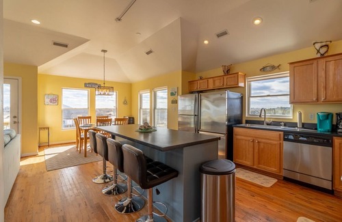 Top Level: Living area with large flat screen TV, dining area, kitchen with bar seating, door to top deck with hot tub and ocean views, King en suite with a tub/shower and private deck with ocean views.