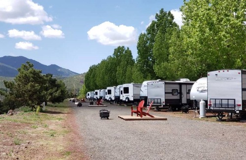 Your luxurious Grand Canyon RV Glamping experience awaits. We are located in the town of Williams, Arizona. The "Gateway to the Grand Canyon" and the location for the Grand Canyon Railway. We are a 54 mile drive to the Grand Canyon and prepared for any season! Bring your friends and family members to experience the outdoors in style at our Boutique Glamping Resort. This is a 2 Queen Bedroom, 1 Sofa Bed, and 1 FULL bathroom camper unit. This unit has heating, air conditioning, and a full working kitchen (with a residential fridge!)! Your home away from home. This unit has a DVD Player, large sliding glass door with views, a deck, chairs for all your guests, a grill, and a fire pit.