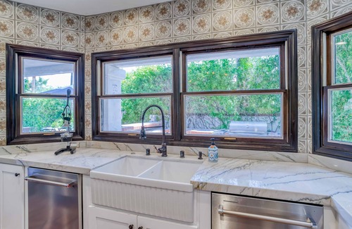 One of the gems of the main house is the spacious chef's kitchen. This kitchen is fully equipped with high end Thermador stainless steel appliances and a wide variety of dishes, pots, pans and every implement you need to make a gourmet meal. It offers a huge chef's island, two sinks, two dishwashers and plenty of counter space. An elegant formal dining room adjoins the kitchen. The dining table can easily accommodate fourteen people for holiday gatherings!