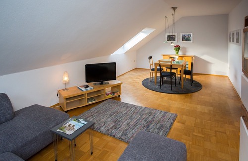 The 60 sqm tastefully furnished apartment with separate access is located on the first floor of our 2 family house. It has a fully equipped kitchen, with a dishwasher and a capsule machine. Capsules for coffee and tea are available for your stay.