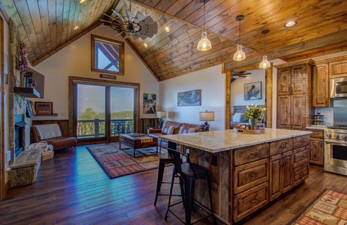 Admire the long range views that extend into Tennessee and Virginia right from the living room or the massive back deck, which offers a gas grill, covered dining table, and a fire table with Adirondack chairs. The front deck is thoughtfully constructed with a pet-friendly gate for peace of mind. This home has two bedrooms, both with king beds and private bathrooms. The beautiful living room separates these two bedrooms providing privacy for all guests. The living room features a large flat screen TV with streaming capabilities and news channels included with Samsung TV plus, and a gas fireplace. There is a cozy couch that makes into a sofa bed to relax after a long day of exploring, as well as two recliners. The kitchen has a huge island with seating for six, stainless steel appliances, quartz counters, and fully equipped to prepare a delicious meal. This property offers a K-Duo Plus which will brew K-Cups or ground coffee of your choice. There is also a separate laundry room off of the kitchen.