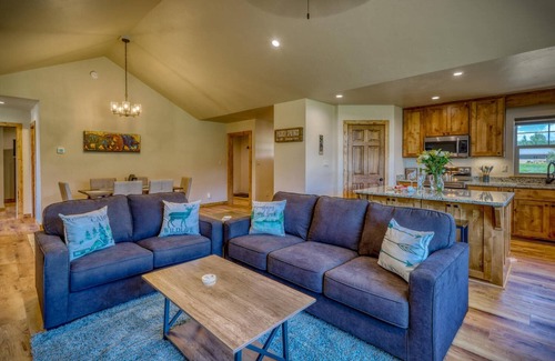 Grey Rock Cottage is nestled in a quiet cul-de-sac in the Pagosa Lakes Suburbs, right by Hatcher Lake, and incredibly close to the San Juan National Forest. Upon entering the home, beautiful artwork and photography welcome you to the mountain modern escape. The open floor plan living room, dining room, and kitchen are filled with natural light, tributes to Pagosa, and amenities galore. Directly ahead is the dining room with plenty of seating, and to the left is the living room with plush seating options, a large smart TV, and a gas stove. Behind the living room is the kitchen featuring an island with seating, all stainless steel appliances, a deep sink, and much more!