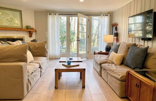 The space features a plush down Cloud couch, a large flat-screen TV, and a cozy fireplace making it the perfect place to sink in, put up your feet and relax. The kitchenette is equipped with a Nespresso coffee maker, mini fridge, microwave and a small dining nook. Enjoy complimentary snacks, fruit and coffee. The bedroom features a queen sized bed with memory foam top, windows and plenty of storage. The bathroom is bright and contemporary with a rainfall shower and high-end toiletries provided for your convenience. Outside, there is a charming patio area, complete with outdoor seating making it the perfect place to enjoy a sunlit morning.
