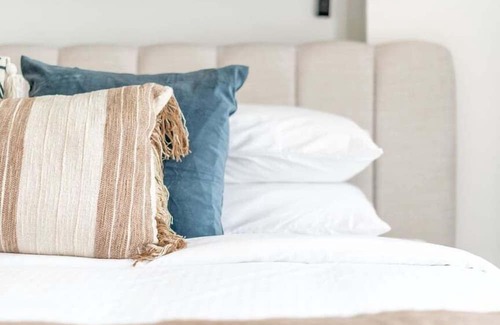 There are two bedrooms. The first bedroom has a king-sized bed, while the second has two single beds. All beds come with complimentary hotel-quality linens to ensure guests sleep well. A small workroom is also available, providing a comfortable and productive space.