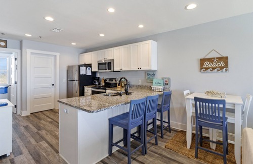 You will truly enjoy the captivating Gulf views from one of two oceanfront balconies, while enjoying your morning coffee and feeling the ocean breeze. We sleep four comfortably with extra sleeping space on the sleeper sofa for two additional guests (for a total of six). We have two bedrooms and two and a half bathrooms, which consist of a King bed in the master bedroom, a Full bed in the second bedroom (and a twin trundle bed that can be taken out for kids), and a sleeper sofa in the living room. All rooms have flat screen TV's and we have a wonderful fully stocked kitchen to cook all of your meals.