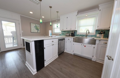 Inside, you’ll find two comfortable bedrooms, each with a queen bed, plus a sofa sleeper in the living room to accommodate up to six guests. The beautifully updated bathroom features a spacious walk-in shower, and the fully equipped kitchen has everything you need to prepare meals during your stay. A washer and dryer, Wi-Fi, and TV service add all the comforts of home.