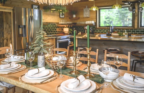 The main living space—kitchen, dining room, and living room—opens onto the forest like a living painting. A wood-burning stove sits at the heart of the living area, adding warmth and ambiance to chilly winter days and evenings.