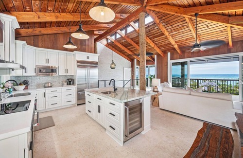 The open-concept living space is a showcase of natural light, soaring A-frame ceilings, and panoramic views of the Pacific. Lounge on plush seating while sliding doors open to ocean breezes. The dining table seats eight comfortably, offering a setting as refined as the menu you choose to share.