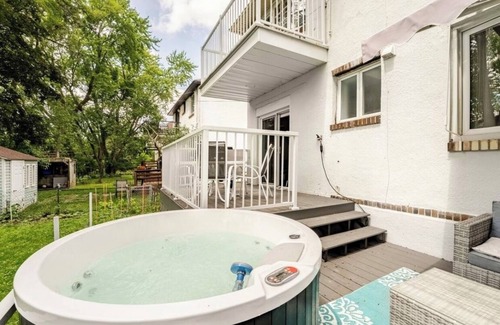 Welcome to this charming newly renovated house in Hampstead. This pleasant property features 2 bedrooms with 2 queen beds and 1 futon in the office space. Sleeps 5. Open concept living room/ dining area with beautiful hardwood floors with inlays. 2 full bathrooms, 2 electric fireplaces, and a large backyard with a double patio deck fully furnished. Includes a 2 person hottub. In a mature area close to public transit, shopping, churches and synagogues. Parking is included.
