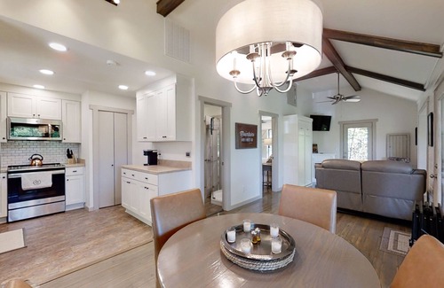 Welcome inside the Joanna Gaines' motif “Happy Camper,” where the fully-equipped kitchen awaits you (owners are parents of five and grandparents of seven, so they know the importance of having cookie sheets, a toaster, and plenty of pots and pans available to you). Even a washer and dryer are hidden in the kitchen closet. A dining table seats four easily, and TV trays are on hand to extend seating or to use while relaxing in living/sunrooms. Additionally, there is a custom-built picnic table and a gas grill right out the door for al fresco dining and grilling.