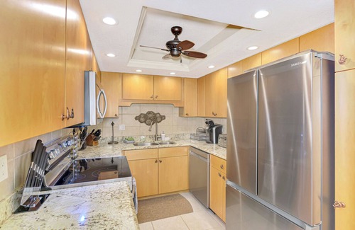 Brand new stainless steel appliances including refrigerator, dishwasher, glass cooktop oven, and microwave. Kitchen is fully equipped for your long awaited vacation. Dishes, coffee mugs, cups, utensils, etc. are all included. Keurig and toaster are available.
