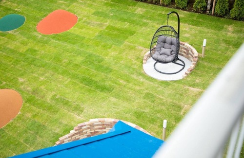 The spacious garden has a sandbox, hammock, outdoor dining table, BBQ space, bonfire, and pizza kiln.
