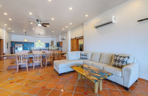 Hawkz House Belize where Vacation happens 24/7/365! This oceanfront home is brand new construction and with impeccable attention to detail it has it all! This second level rental boasts three large bedrooms each with their own stunning ensuite bathrooms. The open concept living area has a full size kitchen with unique two tone cabinets and a huge live edge hardwood dining table. Cool off in the oceanside pool and relax on the covered deck. This rental is perfect for large groups or families.