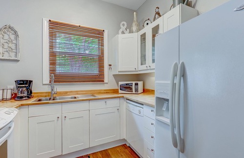 The home's kitchen is a cheerful and welcoming space. It features an oversized peninsula with beautiful wood countertops. Offering a full roster of full-sized appliances, this kitchen comes stocked with a refrigerator, oven, dishwasher, cooktop, microwave and coffee maker. A lovely "breakfast nook" table is tucked under the large window in the kitchen. The large glass sliding doors in the kitchen lead to the home's private deck where you can dine in the shade of an umbrella while soaking in fresh air. A slice of heaven in the city, this deck features a lovely patio table that is made for morning coffee just after sunrise. Yes, this is one of the vacation rentals Savannah GA guests looking for a connection to nature must consider!