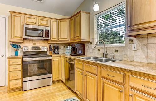 The amenities really do just keep coming with Anchors Away! The home provides air conditioning and heat with the added benefit of ceiling fans in nearly every room. Guests enjoy Wi-Fi and satellite/cable television. Guests also have access to a private backyard. Parking is provided for up to four vehicles.