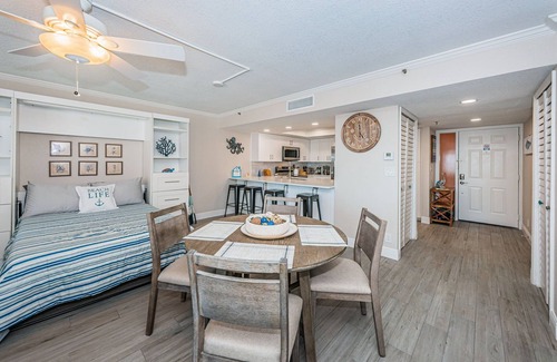 This is an updated condo with all new finishes and coastal décor. Inside you’ll find a spacious layout with all the comforts of home. Whip up delicious dishes in the well-equipped kitchen, complete with a full suite of appliances and generous granite counter space. Enjoy the beautiful sunset from the Gulf views from your private balcony. The spacious bathroom has a double vanity and large shower. The shower is equipped with grab bars and a bench.