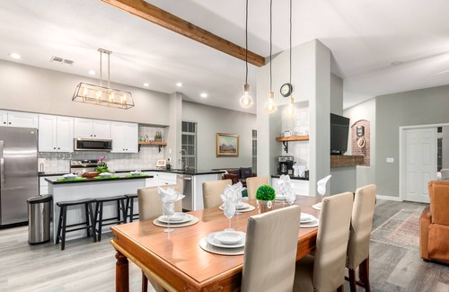 This home remodel was designed by an architect and you can sure tell. Every detail has been thought of in this comfortable space. Step inside and you are greeted with a private living room, quiet and perfect for curling up with a good book. The open concept kitchen and dining room is just beyond the private living room and is also open to the Family Room Space. The kitchen is fully stocked and ready for your prep of a gourmet meal or a BBQ. There is a large kitchen island that provides lots of counter space and storage too. Brand new stainless appliances is another big bonus. The dining room seats 6 and is adjacent to the kitchen. The family room is centered around super seating for everyone and a 65" Smart TV with surround sound. Catch a movie or sporting event with style. The private office is a perfect space to work from home. The three bedrooms are down the hall, with the master in the rear. Massive king bed and luxury sheets and linens overlooking the stunning backyard oasis. Watch TV from bed. The spa like bath is has a new soaker stand alone tub, walk in shower shower and walk in closet as well as double sinks. This master alone is a vacation retreat. The two twin bedrooms are ample sized and share a beautiful bath with a tub and shower combo. You will love the black accents throughout the baths, very impressive.