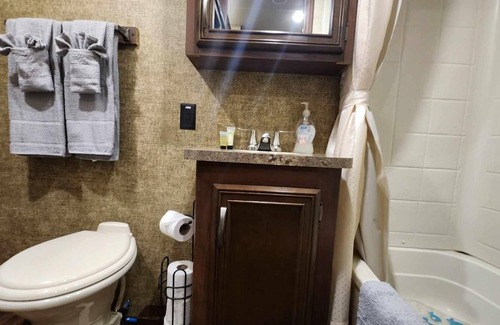 This privately owned Luxury RV Lot is set up with a TURN-KEY fully stocked RV that sleeps 6 with 2 bedrooms and 2 bathrooms and an outdoor kitchen! Perfect for families and large groups! The master bedroom has a Queen bed, the 2nd bedroom has Bunk Beds and 2 Loft Beds AND a full size bathroom! This is perfect for Kids and families traveling together!