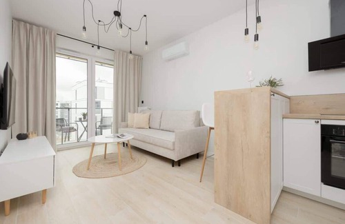 This modern 38 m² apartment accommodates four people and is an ideal place for families or groups of friends. The interiors are bright and cozy, promoting relaxation and comfort. The apartment consists of a living room with a kitchenette, a bedroom, a bathroom with a bathtub, and a balcony. The living room features a comfortable sofa bed for two, perfect for relaxation. Large windows leading to the balcony allow plenty of natural light, emphasizing the brightness and spaciousness of the room. Additionally, the balcony equipped with garden furniture is an ideal place to enjoy morning coffee outdoors. The functional kitchenette, equipped with high-quality appliances, is perfect for preparing home-cooked meals. The bedroom with a double bed ensures a comfortable sleep, and tastefully chosen accessories give the interior a unique and cohesive character. Moreover, there is direct access to the balcony from the bedroom. Evening entertainment is provided by multimedia such as a flat-screen TV with Smart TV technology and free Wi-Fi. The apartment is also equipped with air conditioning and a washing machine, enhancing the comfort of long-term stays. Guests will find a complimentary set of cosmetics, towels, and bed linen on site. For those arriving by car, parking is available in the underground garage. We also welcome guests traveling with pets as the apartment is pet-friendly.