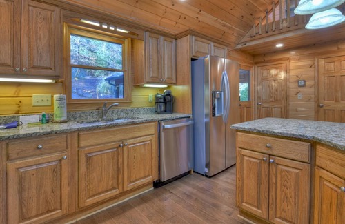 Hibernation Station sleeps 10 guests with a bunk room with 2 twin over queen bunks and a separate queen room in the basement that opens up to steps to the hot tub, outdoor fireplace and creek. There is a full bathroom, living area and a game room with shuffleboard, and foosball table for all to enjoy and unwind in the evenings. The main level has a queen bedroom and full bath with jetted tub, living room, dining room and kitchen combo with an island bar seating for 4 and dining table seating for 6. The master bedroom can be found upstairs with an office space in the open loft and another full bath with jetted tub and stand-up shower. The master has a personal balcony with two rocking chairs overlooking the creek to sit, relax and enjoy your morning coffee or evening wine.