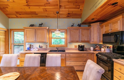 Step into the inviting living room, where vaulted ceilings and a gas fireplace create a warm, welcoming atmosphere. Relax on the leather sofa and take in the breathtaking mountain views through a wall of windows and glass doors that lead to the expansive deck. The well-stocked kitchen is perfect for preparing meals, featuring a dining table that seats eight and can expand to accommodate ten guests. A convenient half bath is located nearby.