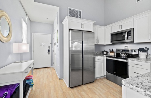 This fully furnished unit boasts a modern, full-size kitchen with all the essentials including a coffee maker, Keurig, toaster, crockpot, blender, microwave, refrigerator, dishwasher, cooktop, pots, pans, dinnerware, and utensils.