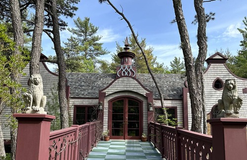 The design details in both properties are stunning. The original owner imported accent pieces from around the world and brought in artists to make this home truly exceptional. High Tower comfortably hosts six adults . The first-floor bedroom has a queen bed, the second-floor bedroom has a king bed, and the third-floor bedroom can be either a king or two twins. The Pool House hosts two adults with one queen bed. An inflatable mattress is available for kids or extra guests.