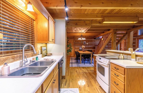 As you enter the home you'll love the classic cabin feeling in the great room. This room offers exposed-beam vaulted tongue & groove ceilings, a stone gas fireplace with TV mounted above and cozy furniture arranged in front of it, dining table for 6, and a well equipped kitchen with stainless steel appliances and an island that also has 2 bar stools. Newly installed fiber internet keeps you connected while you relax.