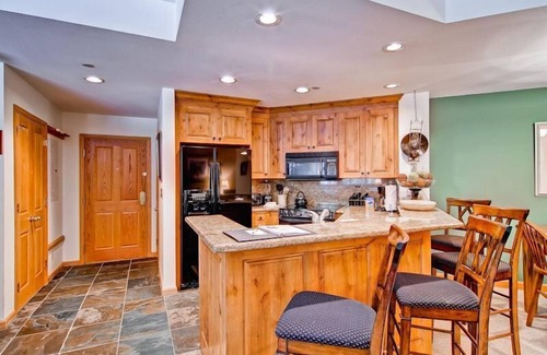 This first floor, ski-in, ski-out residence offers a wood burning fireplace and sleeper sofa in the living room, a full kitchen, two guest suites, each with an attached bathroom and king bed plus a bunk room with twin-over-twin and twin-over-double beds. Additional features include washer/dryer, garage parking for one vehicle and access to a ski locker with boot heater.