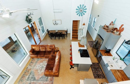 Our Amazing Modern Farmhouse is located on a scenic ranch in Dripping Springs, Texas. The house sleeps up to 8 guests on 5 beds, has a full kitchen, cowboy pool, hot tub, arcade, outdoor fire pit, and plenty of space to relax.