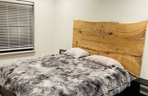 Enjoy this modern new construction barndominium! Featuring a large industrial ascending glass overhead door allowing for connected indoor to outdoor covered patio space, perfect for beautiful morning sunrise views or evening entertainment. Master with private ensuite bathroom and oversized shower. Additional loft space with additional TV for recreation or additional sleeping, full modern amenity kitchen & wood burning fireplace. Beautifully custom designed and crafted furniture details throughout that speak to this scenic wooded escape!