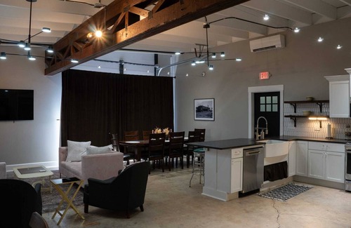Stay in a restored 1920 historic Chevrolet building, with private entry and covered private garage area. 2 bedroom with king beds and 2 ensuite baths. Coffee bar, Full kitchen with cooking amenities, 8-seat dining table and bar area with two stools. Step free entrance to all areas. We have the original shop floors. The rock building is one of the largest cobblestone buildings in the state of Arkansas. Features cobblestone on some interior walls as well. Enjoy a master bath with custom pebble shower and rain head as well as a soaking tub.