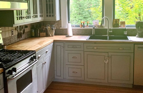 The kitchen is filled with high end appliances, cookware, and dining ware. Cooking necessities such as sugar, flour, spices, oil, vinegar are all available to use.
