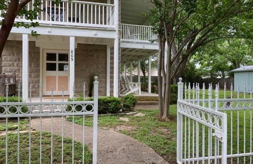 Relax at Fritztown 1910! Home built in 1910 when the locals called Fredericksburg Fritztown. Great for Mid-Term stays with fast WiFi for working from home. Garage rental and washer dryer included in price! Made from historic Basse Block (and Roos). Stately, white iron fence leads to spacious yard. Enjoy country breezes and tank house views on roomy, contoured Adirondack chairs on the porch or at the fire pit. Unwind in the rocking chairs on the west balcony. Nap in the hammock under the pecan and live oak trees. Hardwood floors throughout including longleaf pine upstairs. All new furnishings and upscale touches.
