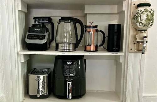 - Coffee and tea station (Keurig, drip coffee machine, electric kettle, and French press)