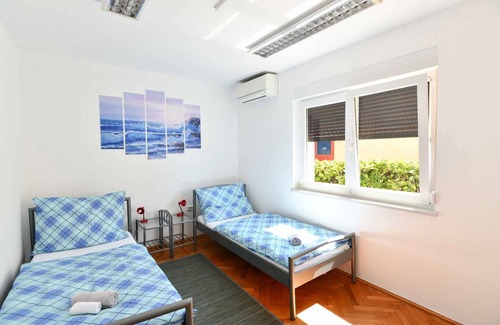 The holiday apartment is located in a detached house. The property is located in the center. The domicile is also popular because of the view over the sea from the property and the sunny location. For common use are available: sunbathing area, sun lounger, garden shower, grill possibility, terrace and garden furniture.LocationRijeka, district Kantrida. The holiday apartement is located on a open garden plot with meadow, flowers and trees. The landlord lives permanently in the house, but uses a seperate entrance. The access goes via a side road (asphalted). Parking lot (for 2 cars) on the property and the street in front of the house. Specialair conditioner. 3 devices. Facilities: internet access (WLAN). TV reception takes place via satellite. Dogsallowed, EUR 10.00/pet per day. DistancesShopping opportunity 50 m, restaurant 100 m, town center 6 km. Rijeka: indoor swimming pool 50 m, pharmacy 500 m and railway station, doctor, bank each 5 km. Children's playground 300 m.In summer: Adria 100 m in Rijeka (beach 100 m in Rijeka with gravel and rocks). Rijeka: fishing 100 m and tennis, diving, boat rental, boat launch each 300 m. DivisionHoliday apartment, 1 floor, 3 rooms (including 2 bed rooms), 70 sqm, in total 6 beds (including 2 additional beds). RoomThe entrance in your holiday apartment is located on the ground floor and leads directly in the hallway with wardrobe and doors to all rooms. Bedroom with 2 single beds. Bedroom with 2 single beds and access to the balcony. Living/bedroom with 2 extra beds on couch/sofa, sitting area, TV and access to the balcony. Kitchen with dining area, gas stove (2 flames), electric stove (2 plates), oven, extractor hood, fridge (icebox), microwave, coffee machine and electric kettle. Bathroom with bathtub with shower facility, washing machine, 1 sink, WC, hairdryer and window. Separate toilet with washing machine, 1 sink, WC, bidet and window. Terms of lease and pricesIncluded in the priceinternet access, air conditioning, parking place, electricity, gas, water, Bed linen (weekly change), Wireless Internet access. Side costs-Additionally(Payable when booking)/local tax.Costs on the spot:/Obligatory:final cleaning 50 € per object per stay.Deposit:EUR 100,-/object