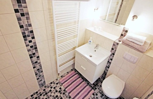 This holiday apartment is on the ground floor of the old town house. It has a generous living room with a bed, a bedroom, a separate walk-through kitchen and a shower room. After entering the house there is the front door on the right. You step into the generous living room. The apartment was renovated in 2015 and provides modern furnishing and attractive accessories. Owing to being situated in an old building with typical high ceilings, the interior looks very homely and generous. After a day trip you can relax in the living room on the sofa. There is also an additional sofa bed. Two big windows allow plenty of daylight in. A wall-mounted flatscreen TV with satellite channels and a USB port provides entertainment in the evening. The bedroom is furnished with a generous double bed (180 x 200cm) with bedside tables and reading lamps on either side. The kitchen enables convenient self-catering with a stove with four rings and an oven, a sink, fridge and dishwasher, kettle and coffee machine, along with a long dining table for four people. Alternatively, in good weather, you can move out through the external door onto the terrace and enjoy meals outdoors. The bathroom has a walk-in shower with a shower curtain, a washbasin, a towel radiator and a WC. Free wireless Internet access is provided.