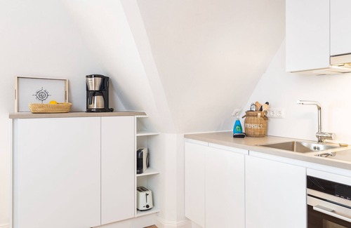 Take a time off and come here for a stay in this cozy Frisian apartment with a fireplace to relax and calm down. This apartment is ideal to do so as it is located very close to the coast line. It has a garden and a terrace inviting you to spend some time outside. The terrace is equipped with garden furniture. This apartment was fully renovated and newly furnished in the spring of 2019. The apartment is located in the house Hafis, a typical frisiand house, with a thached roof; nevertheless, the apartment Friesenglück has its own separate entry. On the first floor you can step into a fully equipped kitchen with a stove, an oven, a dishwasher, a kettle and an espresso – and coffee machine, and a dining table. Leaving the kitchen, there is the living room which is decorated with a mix of modern and original Frisian-style, it has blue tiles on the wall and a nice fireplace, a TV and a comfortable sofa. The bathroom is located on this floor, it has a shower, a toilet, a washbasin and a hairdryer. On the second floor you can find the bedroom with a double bed, this apartment is iperfect for 2 adults. However, you are welcome to make a request to bring a child up to the age of 9. There is a parking lot available for guest, it is located in the front side of the house.