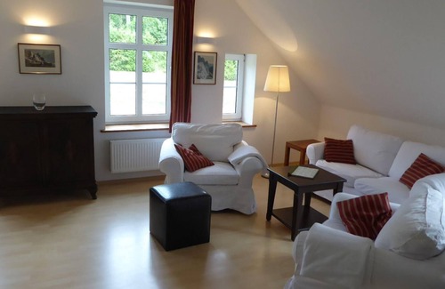 This apartment is the middle one of three exclusive apartments in a manor house in Gingst – Rattelvitz on Rügen. The apartment has a gallery. It is accessed up stairs within the manor house.