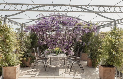 A glass door leads from the living room to the beautiful, spacious terrace, covered by a gazebo decorated with climbing roses and jasmine. The view of the valley and the swimming pool is breathtaking.