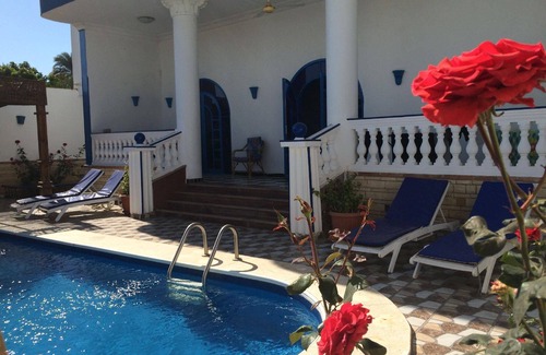 Very private holiday home with pool, garden and roof terrace in a beautiful rural setting. Villa Kaslan is very privately located in the middle of date palms, banana plantations, sugar cane and wheat fields on the West Bank of Luxor. The property itself has many flowers, shrubs, lime, mandarin and papaya trees, peppermint, basil..... The peace and quiet on site is only interrupted by the chirping of the birds during the day and the chirping of the crickets in the evening and you can really relax here. Whether by or in the swimming pool, on the large roof terrace with panoramic views, in the garden or on the separate terraces of the holiday flats; there is always somewhere to relax.