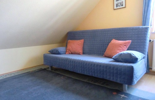 The non-smoking apartment occupies the whole upper floor with 60m² of living space. After the house entrance, you go through a door downstairs in the house to the stairway and from there to the front door into the apartment. It comprises a bedroom with a double bed, a living room with a sofa bed, an LCD TV and an integrated kitchen unit, a dining room with a pull-out sofa bed, and a modern daylight bathroom with a shower cubicle, WC, washbasin, cupboard, mirror and bath. The bedroom is furnished with a double bed (180 x 200cm), two bedside tables and a wardrobe and opens onto the balcony. The living room also opens onto the balcony and you can relax on the suite after a day trip, with the LCD TV with a satellite receiver and a stereo system providing entertainment in the evening. The sofa bed is 140cm wide and is suitable for one or two people. The integrated kitchen enables practical self-catering with a four-ring hob and an oven, a fridge, microwave, coffee machine, kettle and toaster. The hallway linking all the rooms leads to the dining room, where a dining table with four high-backed chairs invites you to dine. Next to the dining space there is a second sofa bed (160cm wide) for two further people. Wi-Fi is available free of charge throughout the apartment.