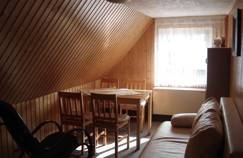 The holiday apartment is located in a detached single-family home and is furnished in a functional and typical country style. Also due to its quiet and sunny location the domicile is popular.LocationNeuendorf (Hiddensee). The holiday apartement is located on a open plot with meadow. The landlord lives permanently in the house, but uses a seperate entrance. In the original fisherman's house in the typical country style with thatched roof, completely renovated in 1996, the holiday apartment: RUE HID 001 and RUE HID 002 are (each 3 persons) in the attic. Cloyster be parked on the mainland on security parking - Hiddensee is car-free. Specialelectric heating. TV reception takes place via satellite. Dogsnot allowed. DistancesShopping 200 m, restaurant 30 m, town center 450 m. Shopping opportunities are limited, grocery shops may be closed in January, February and March In summer: Baltic Sea 100 m in Baltic Sea (beach featuring sand). horse riding in 7 km. boat launch in der Umgebung 300 m. DivisionHoliday apartment, 1 floor, 2 rooms (including 1 bedroom), 35 sqm, in total 3 beds (including 1 additional bed). RoomThe entrance to your holiday apartment is located in the attic and leads over an internal staircase directly into the living room. Bedroom with 1 double bed. Eat-in kitchen (walk-through room) with 1 additional bed on couch/sofa, sitting area, TV and radio. Cooking nook in the kitchen-diner with dining area (3 seats), electric stove (ceramic hob, 2 plates), fridge, coffee machine, toaster and electric kettle. Bathroom with shower, 1 washbasin, WC, hairdryer and window. Terms of lease and pricesIncluded in the pricechildren bed, electricity, water, heating, final cleaning, bed linen, hand towels. Side costs-Costs on the spot:/Obligatory:local tax by local tariff.Deposit:No deposit.