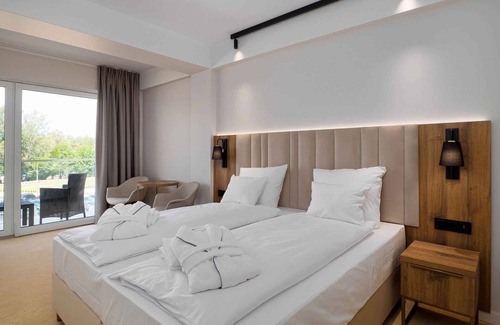 The holiday apartment is located in an apartment house and is modern furnished. The property is located in a holiday complex. For use are available: parasol, sun lounger, children's playground, terrace and lift. Garden, sun loungers on the beach - free of chargeHoliday resortlobby, reception (24 hour service), bar, coffee shop, internet (WLAN) and children's playroom. Luggage service, luggage storage, currency exchange possible LocationJaroslawiec. The holiday apartement is located in a holiday complex. Parking lot on the property. There is a charging station for electric cars on the property. Charging station for electric cars - depending on availability, optional for a fee on site Specialair conditioner, central heating. Facilities: cot, high chair and internet access (WLAN). PoolOutdoor pool. Indoor swimming pool (20 m x 14 m, for common use). Swimming area: Children from 0 years WellnessIn the complex: whirlpool, steam bath, sauna and massage. LeisureIn the complex: gym. animation for children from 4 years. Size of wellness area 600 m², Finnish sauna - free of charge, infrared cabin - free of charge, salt grotto, relaxation room, fitness programs - free of charge, bicycle room, children's club: opening times from January to December, children from 4 to 16 years, baby monitor, bottle warmer, children's program Dogsallowed. Free of charge. DistancesShopping opportunity 20 m, restaurant 20 m, town center 50 m. The nearest public transport stop is 20 m away. airport in Gdansk 200 km. indoor swimming pool in Jaroslawiec 300 m. railway station in Slawno 20 km. Nearest town: Darlowo 20 km, Other distances: Amber Museum 100 m Lighthouse 100 mIn summer: Baltic Sea (beach 150 m in Jaroslawiec). boat launch in Darlowo 20 km. Lake: Wicko 2 km DivisionHoliday apartment, 1 floor, 2 rooms (including 1 bed rooms), 62 sqm, in total 4 beds (including 2 additional beds). Smoking is prohibited in the property. RoomThe entrance in your holiday apartment is wheelchair accessible. Bedroom with 1 double bed and Overcrowding cot possible: Yes. Living/bedroom with 2 extra beds on couch/sofa, sitting area, TV and access to the balcony. Kitchenette with fridge, electric kettle and Gas or electric stove, basic kitchen equipment. Bathroom with shower, WC, hairdryer and Bathrobe - free of charge. Credit cardsVisa, MasterCard, Diners. Terms of lease and pricesIncluded in the priceinternet access, half-board, high chair, internet access, air conditioning, sauna, electricity, water, heating, final cleaning, bed linen, hand towels, sunloungers at the beach, billiard, bathrobe, steam bath, sunloungers, baby cot – please order at booking, parasol. Side costs-Additionally(Payable when booking)/local tax.Costs on the spot:/On request:parking place 10 € per car per day.Deposit:No deposit.