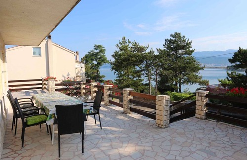 The holiday apartment is located in an apartment house, was renovated in 2016 and is furnished in a modern and typical country style. The property is located in a residential area, in the town centre. Also due to the view over the sea from the property and its quiet and sunny location at the water the domicile is popular. Available for shared use: barbecue facilities, terrace and garden furniture.LocationŠilo. The holiday apartement is located on a 100 sqm enclosed garden plot with flowers, shrubs and trees, bordered by a fence. The landlord does not live in the house or on the property. House is located in place Šilo, just 50m from the sea. House has two apartments. Apartment on the high ground floor can hold up to 7 persons. Nice terrace and grill are also at guests disposal. Air conditioning and wifi are included in price. Pets are allowed and charged extra. Guests have a parking space in the yard. Access is via a side road (asphalted). Parking (for 4 cars) is available on the property. Specialair conditioning.Facilities: internet access (WLAN). TV reception takes place via satellite. Dogsallowed, EUR 20.00/pet per day. DistancesShopping 250 m, restaurant 150 m, town center 100 m. railway station, cinema each 50 km in Fiume. Malinska: bank 15 km and discotheque 15 km. Main road 30 m. In summer: Adriatic Sea 100 m in Silo (beach 100 m in Silo featuring gravel, stones and bathing plateaus). DivisionHoliday apartment, 1 floor, 4 rooms (including 3 bedrooms), 90 sqm, in total 7 beds (including 1 additional bed). RoomThe entrance to your holiday apartment is located on the mezzanine floor and leads directly into the hallway with doors to all rooms. Living room (20 sqm) with sitting area, TV, dining area (6 seats) and access to the terrace (20 sqm, garden furniture, 1 table, 8 chairs). 2 bedrooms each (20 sqm) with 1 double bed. Bedroom (20 sqm) with 1 double bed and 1 additional bed on bed (smaller 2.00 x 0.90 m). Kitchen with dining area (2 seats), electric stove (4 plates), oven, extractor hood, fridge (icebox), coffee machine and electric kettle. Bathroom (5 sqm) with shower, 1 washbasin, WC, bidet and window. Separate toilet (5 sqm) with 1 washbasin, WC and window. Terms of lease and pricesIncluded in the priceinternet access, air conditioning, parking place, electricity, gas, water, final cleaning, bed linen, Wireless Internet access. Side costs-Additionally(Payable when booking)/additonal fee for short-term stays (less than 4 nights) obligatory 30% per stay. local tax.Costs on the spot:/Obligatory:registration fee 4 € per person per stay.Deposit:EUR 150,-/object