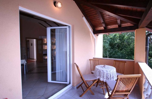 The holiday apartment is located in a detached single-family home, was renovated in 2013 and is furnished in a typical country style. Also due to the view over a panorama from the property and its quiet, sunny and secluded location the domicile is popular. Available for your exclusive use: barbecue facilities, terrace, pavilion and garden furniture.LocationŠilo, district Polje. The holiday apartement is located on a enclosed garden plot with meadow, flowers and trees, bordered by a fence. The landlord lives permanently in the house, but uses a seperate entrance. Access is via a side road. Parking (for 2 cars) is available on the property. Specialair conditioning.Facilities: internet access (WLAN) and washing machine. TV reception takes place via satellite. Dogsallowed, EUR 10.00/pet per day. DistancesShopping 600 m, restaurant 2 km, town center 2 km. discotheque, bank each 15 km in Malinska. railway station, cinema each 50 km in River. doctor, pharmacy each 2 km in Šilo. Mud Meline - Soline 2 km, Biserujka cave 10 km, Dobrinj 3 km, Crikvenica near - combined with fast boat from Silo, Krk town 20 km, Malinska 12 km, Rijeka 55 km, Omisalj Airport 20 km. In summer: Adriatic Sea 2 km in Šilo (beach 2 km in Šilo featuring sand, gravel and bathing plateaus). tennis, fishing, diving, boat rental, boat launch each 2 km in Šilo. DivisionHoliday apartment, 1 floor, 3 rooms (including 2 bedrooms), 70 sqm, in total 6 beds (including 2 additional beds). RoomThe entrance to your holiday apartment is located on the 1st floor