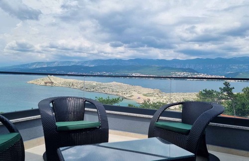 The holiday apartment is located in an apartment house and is furnished in a modern and luxury style. Also due to the view over the sea from the property the domicile is popular. Available for use: garden furniture.LocationŠilo. Parking (for 1 car) is available on the property. Specialair conditioning, central heating.Facilities: internet access (WLAN). TV reception takes place via satellite. PoolAll pools are available for shared use. Outdoor pool (usable from early May to early October, 4 m x 9 m, depth 1,40 m). Dogsnot allowed. DistancesShopping 1400 m, restaurant 60 m, town center 1000 m. In summer: Adriatic Sea 20 m in Šilo (beach 20 m in Šilo featuring rocks). DivisionHoliday apartment, 1 floor, 2 rooms (including 1 bedroom), 50 sqm, in total 2 beds. RoomThe entrance to your holiday apartment is located on the 2nd floor. Living room with sitting area, TV and access to the balcony (10 sqm). Bedroom with 1 double bed and TV. Kitchen with dining area, electric stove, dishwasher, fridge (icebox), microwave, coffee machine, toaster and electric kettle. Bathroom with with shower facility, shower, 1 washbasin, WC and hairdryer. Terms of lease and pricesIncluded in the priceOutdoor pool, dish towels, air conditioning, parking place, electricity, gas, water, final cleaning, bed linen, hand towels, Bed linen (weekly change), hand towels (weekly change), Wireless Internet access. Side costs-Costs on the spot:/Obligatory:registration fee 5 € per person per stay. local tax by local tariff.Deposit:No deposit.