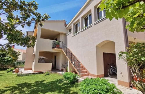 Not far from the old town of Bale, the 60m² flat is located on the ground floor of the house and has 2 bedrooms, each with a double bed. From the living room with its well-equipped open kitchen, you have direct access to the 12m² terrace on the garden side. A wonderful barbecue area is available to guests in the garden near the pool. The cozy seating area invites you to enjoy convivial evenings around the barbecue. The large saltwater pool is shared by the guests of Villa Nina and the neighboring Casa Istriana.